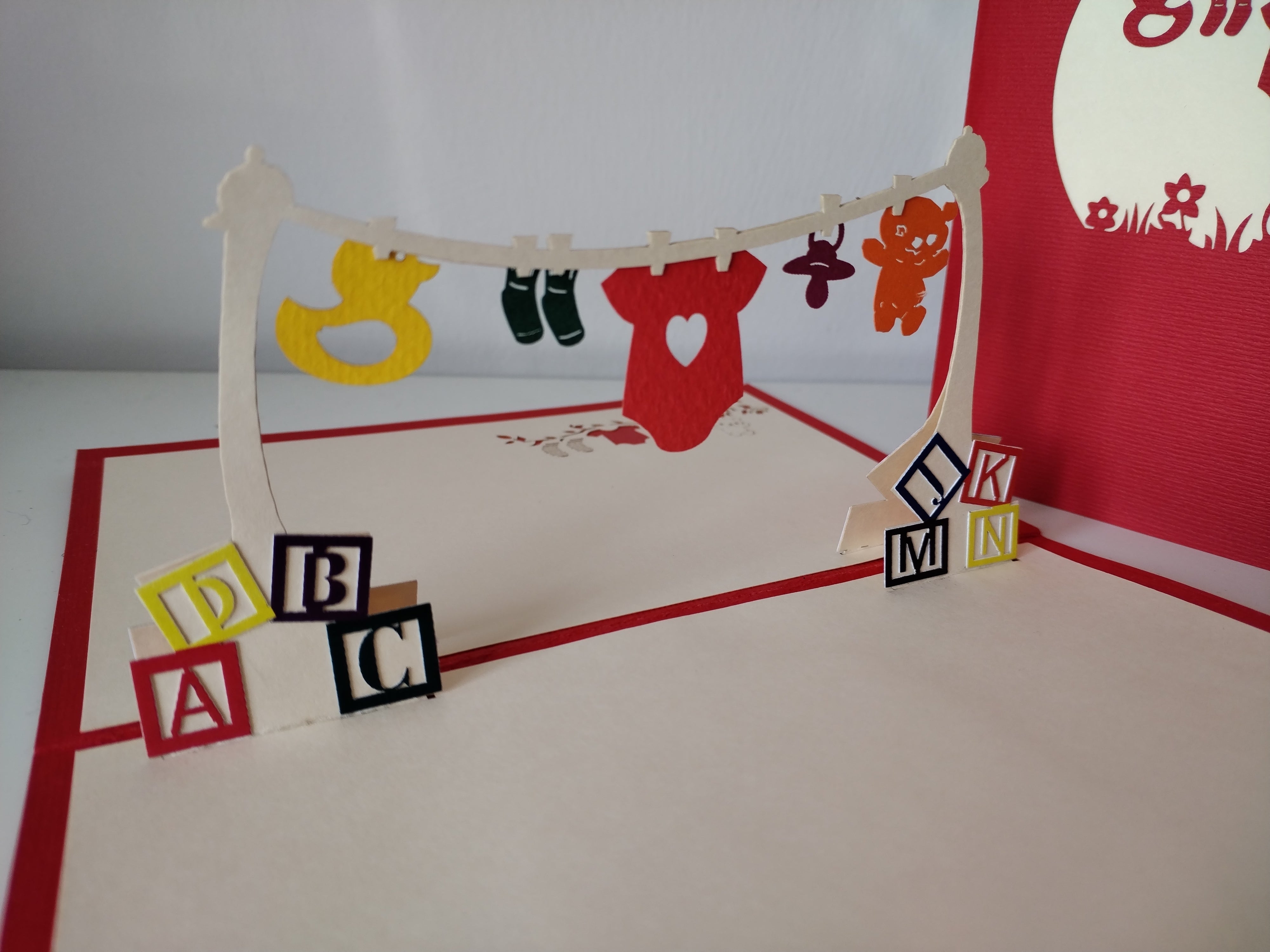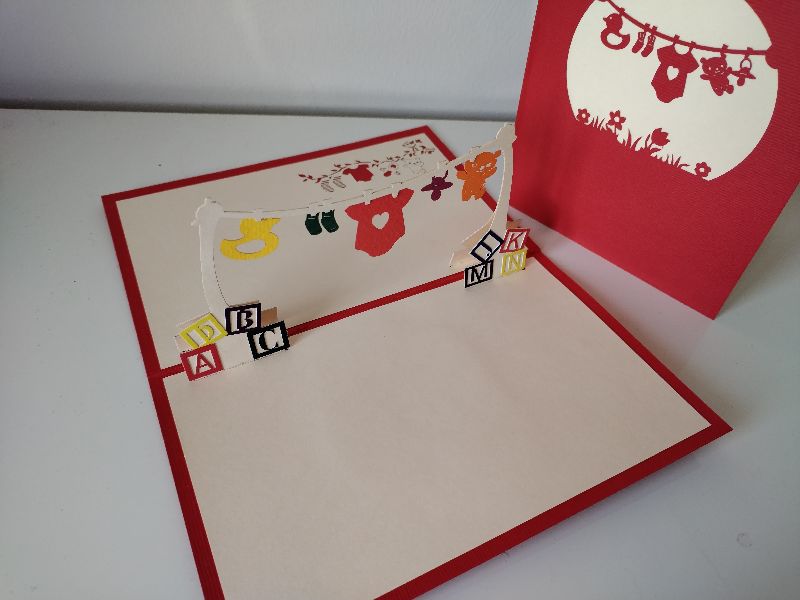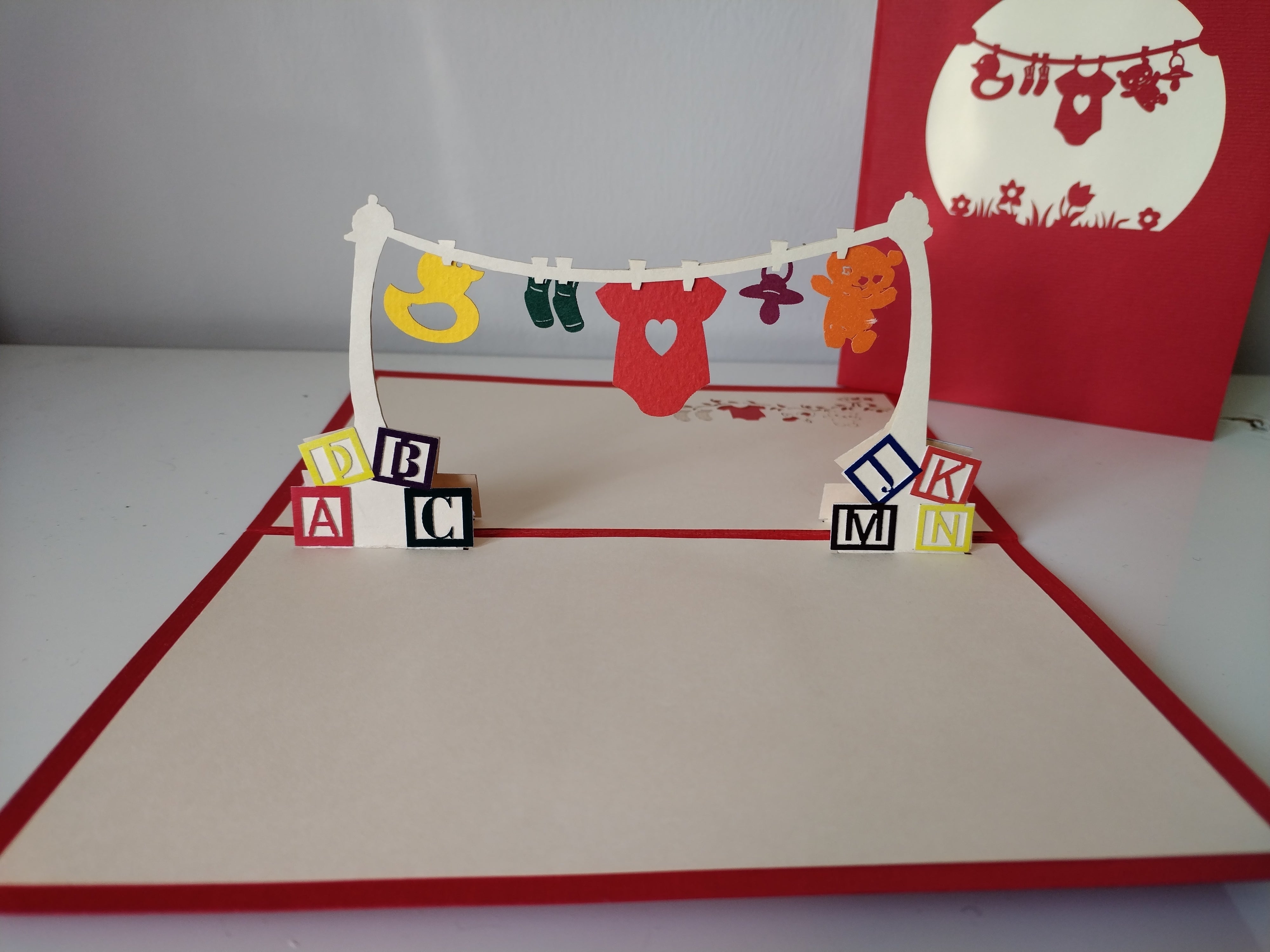 Celebrate new arrivals with the Baby Clothesline Pop Up Card in vibrant red. Perfect for welcoming a newborn or congratulating new parents, it combines creativity with warmth to make your wishes truly memorable.