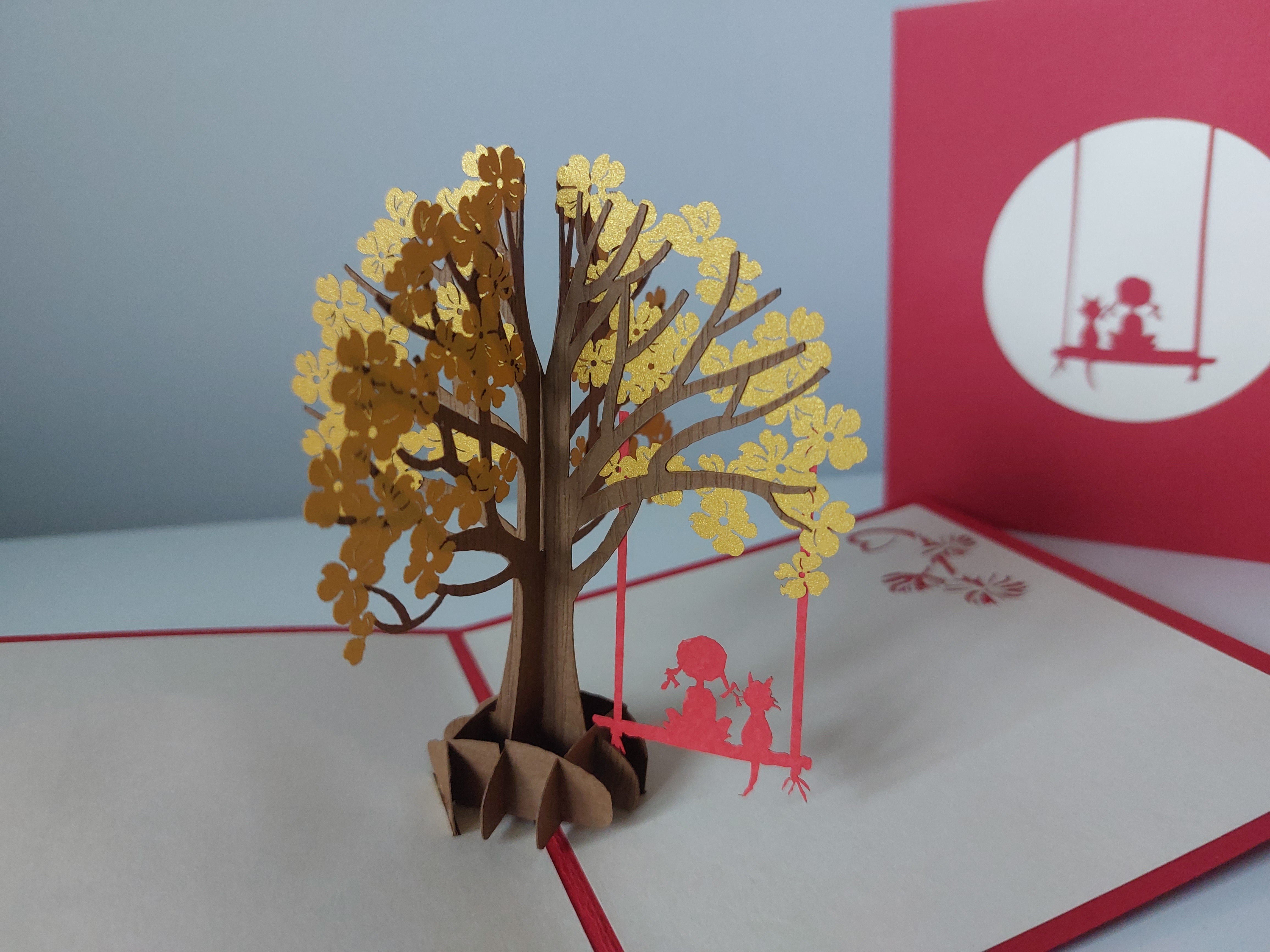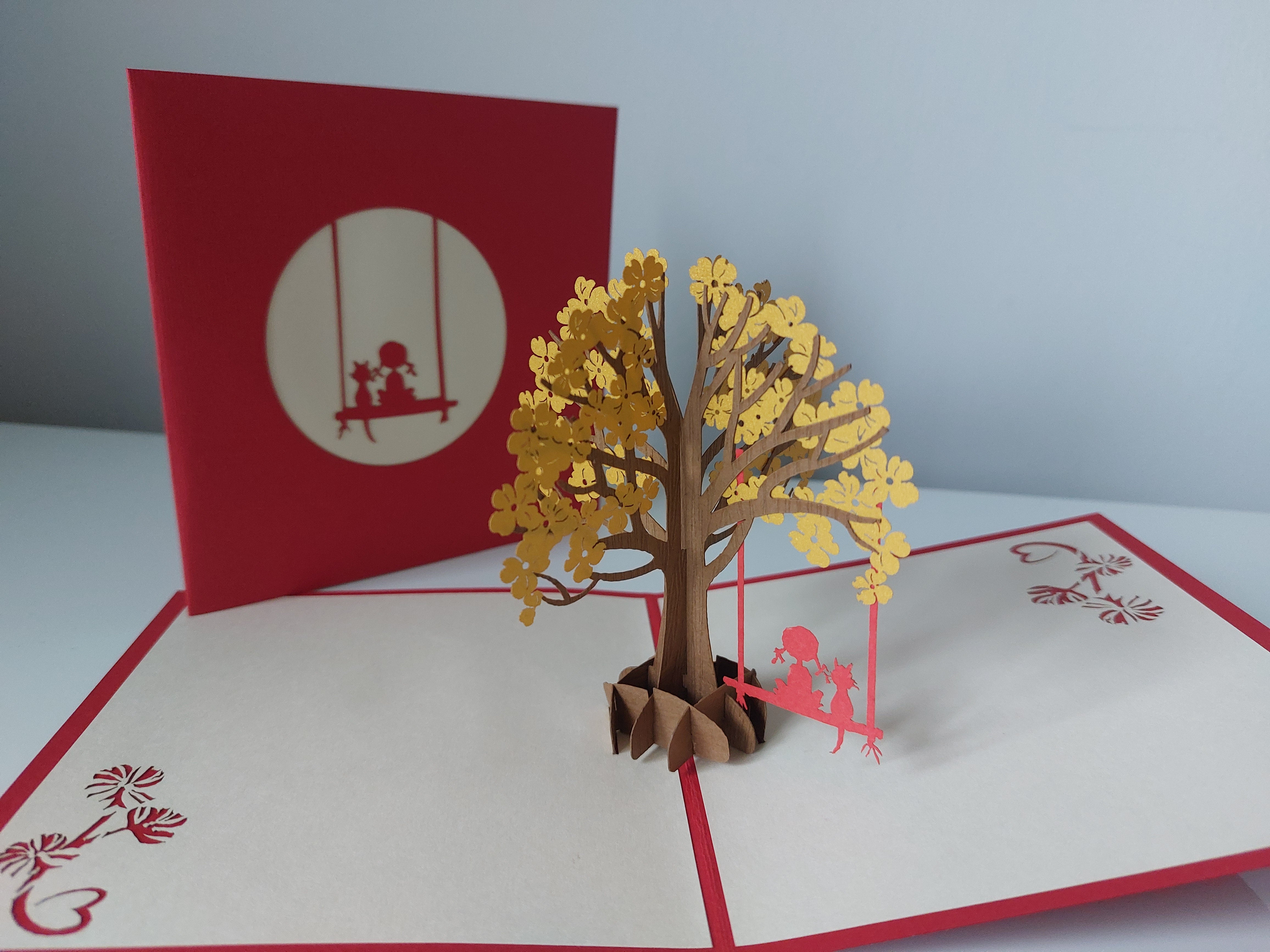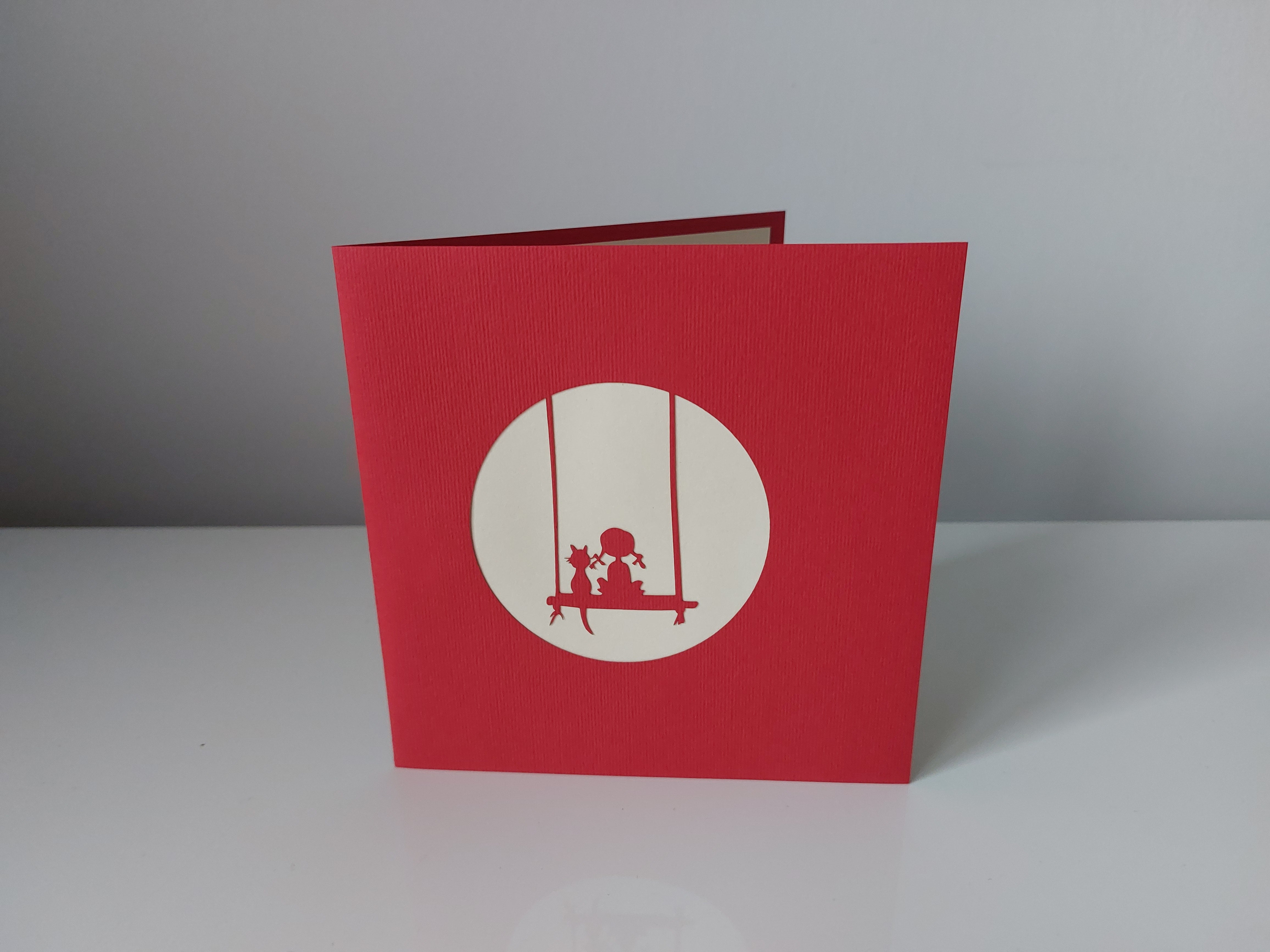 A cute pop-up card that brings a whimsical scene to life. A girl swings beneath a leafy tree with her furry feline friend perched beside her, perfect for birthday's, communions, or just because!