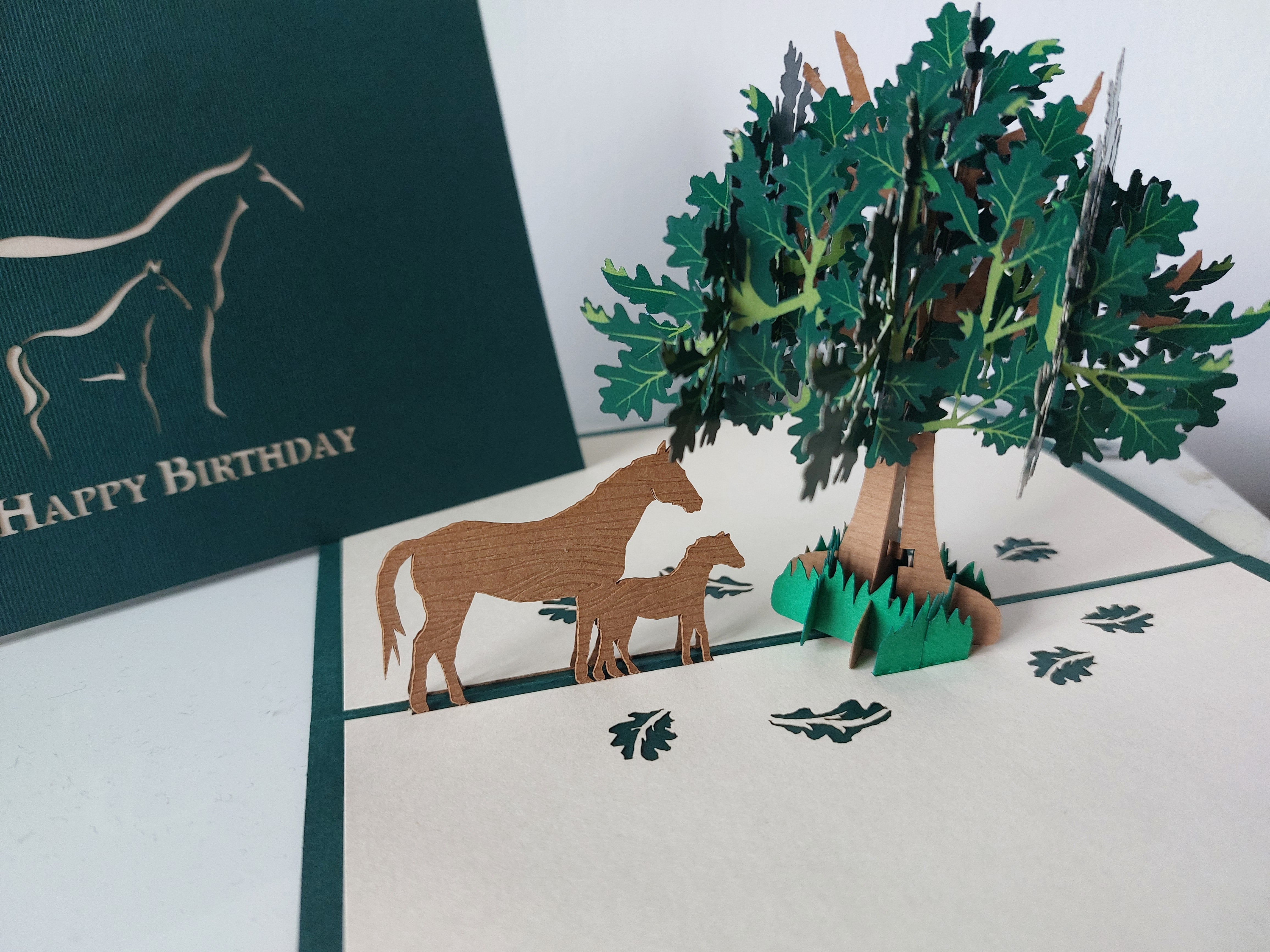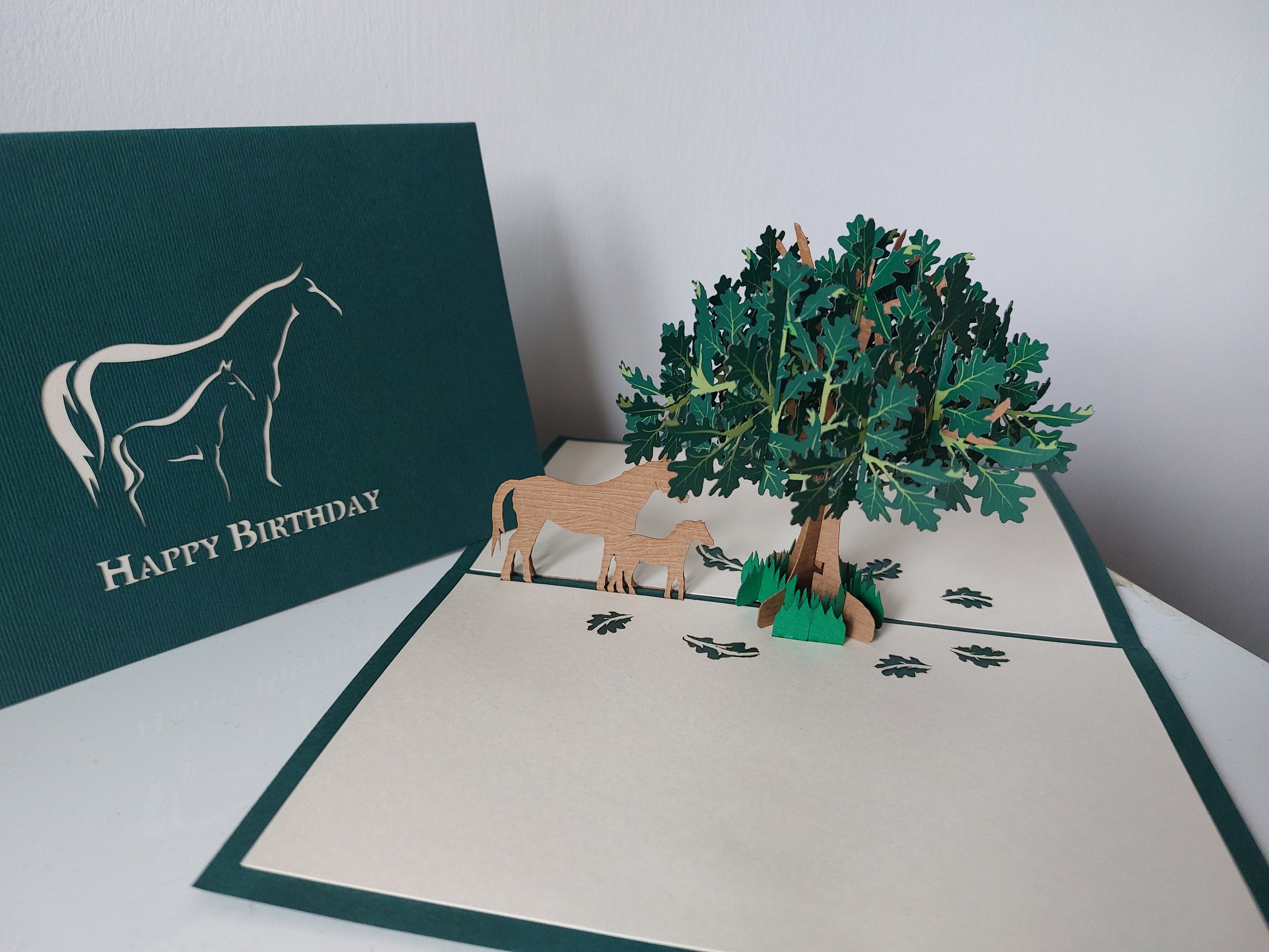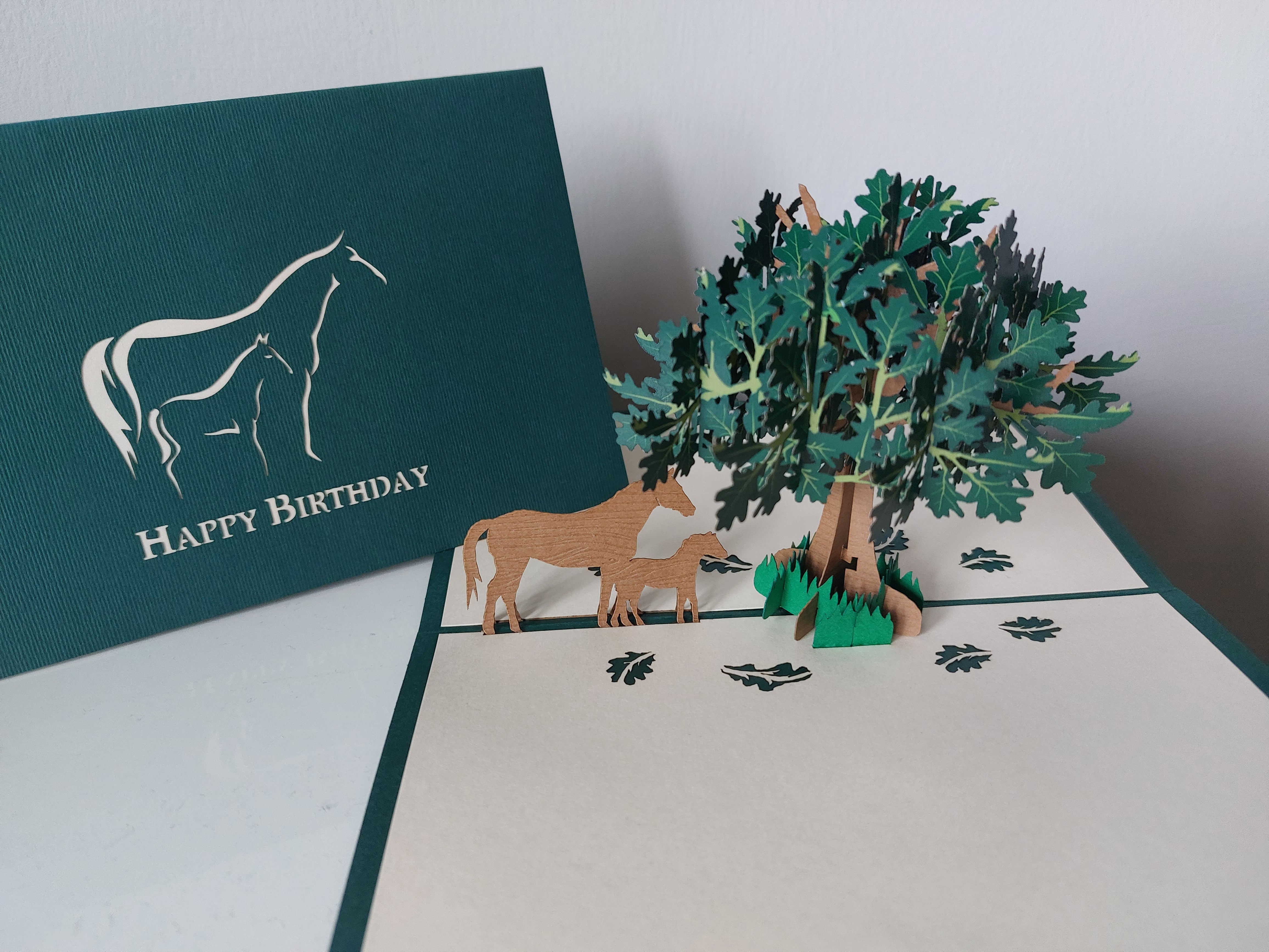 Celebrate that special birthday with the Birthday Horse and Foal pop-up card, featuring a charming scene of a horse and foal standing peacefully beneath a sturdy oak tree. Perfect for horse lovers and nature enthusiasts alike.