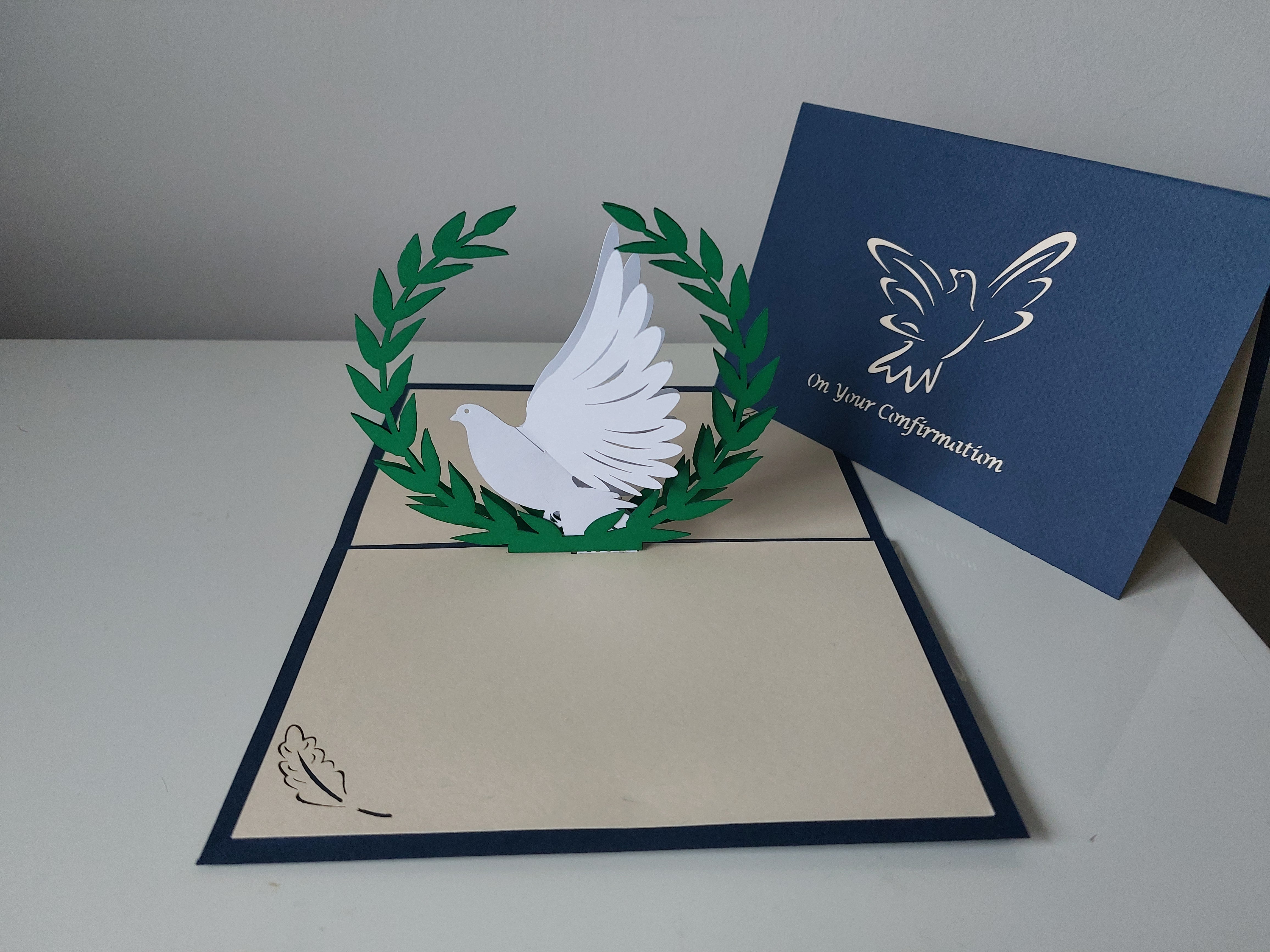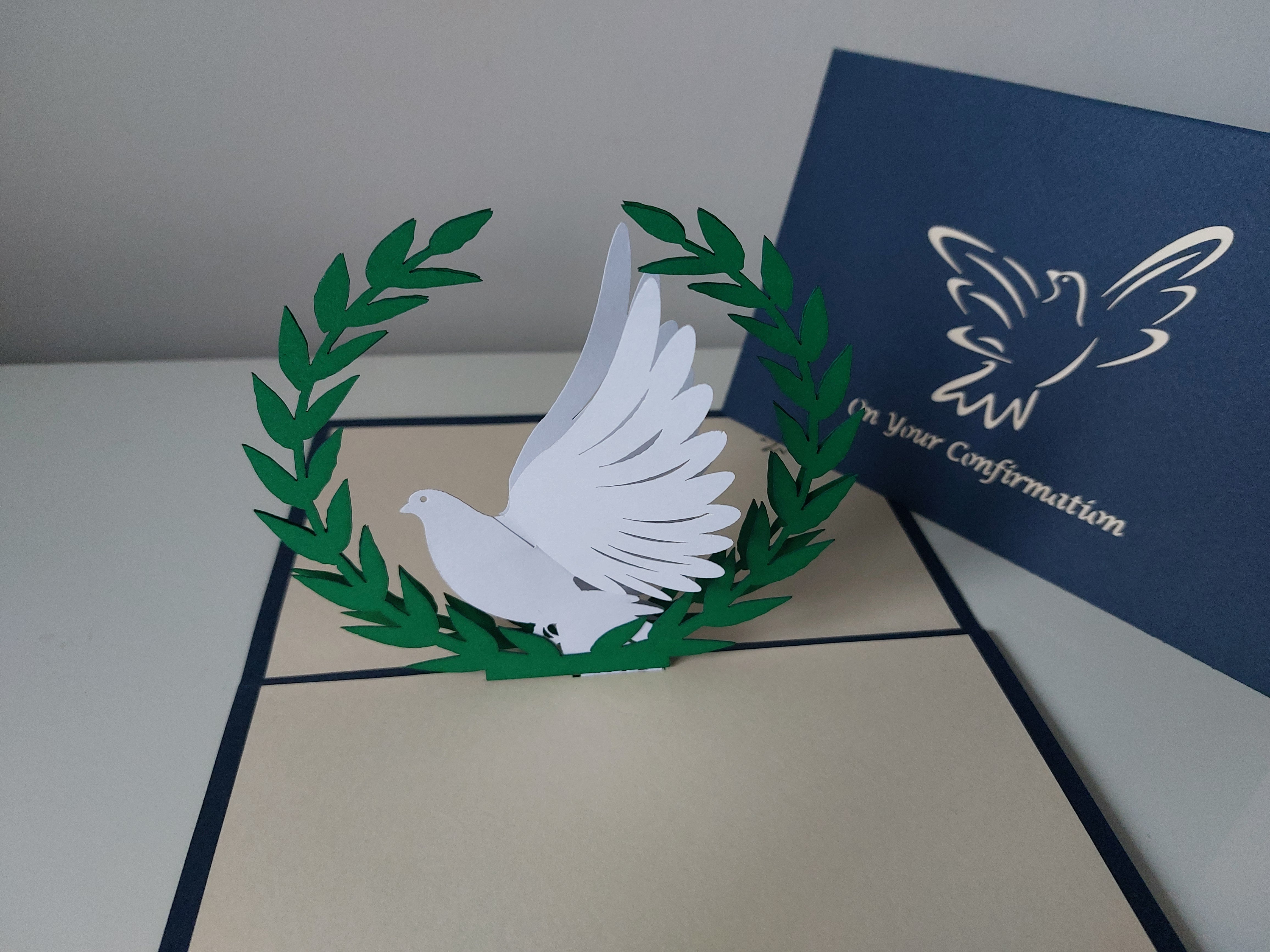 Celebrate their confirmation with this playful pop-up card! Perfect for the big day, this dove-themed card is sure to bring a smile to their face. Shower them with love and good wishes for their journey ahead!