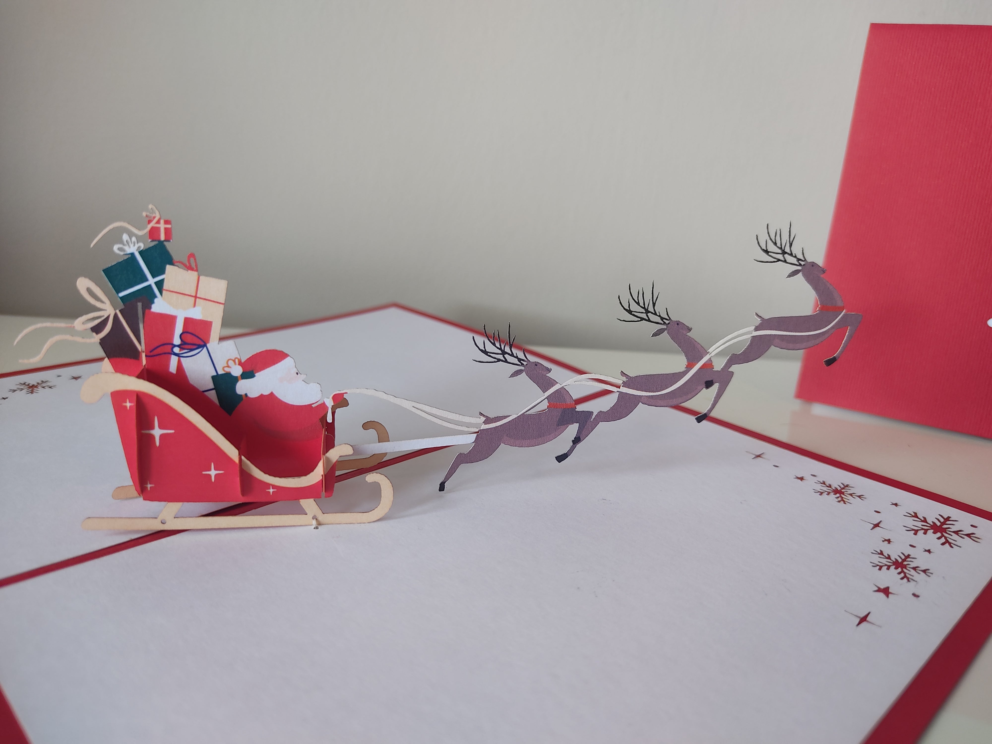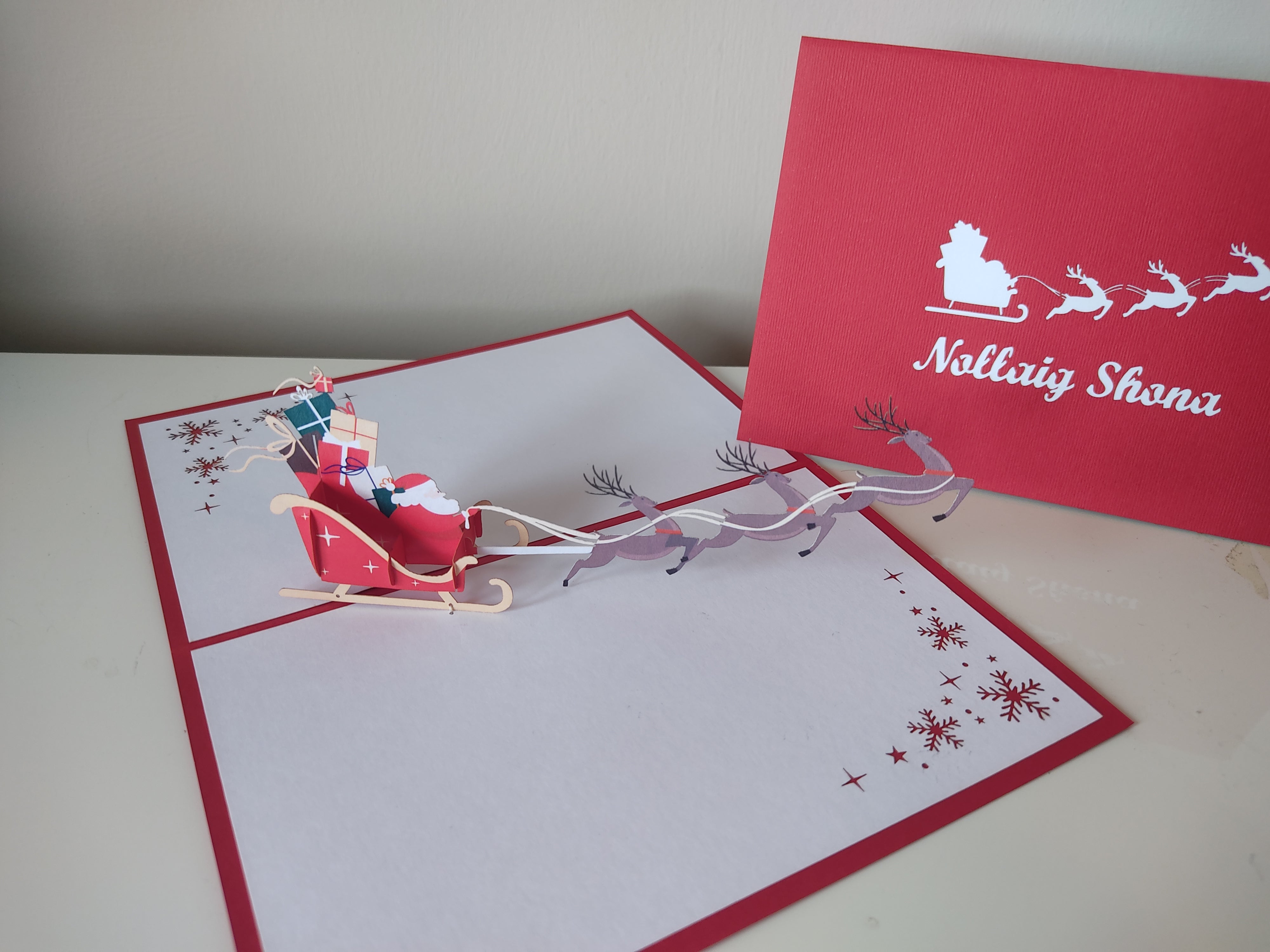 Bring festive cheer with the "Daidí na Nollag" pop-up card. Featuring Santa and his sleigh soaring through the night sky delivering presents, this card captures the wonder of Christmas in a unique, tactile way. Its intricate design makes a memorable keepsake, perfect for spreading joy and celebrating the season with loved ones in a truly special style.