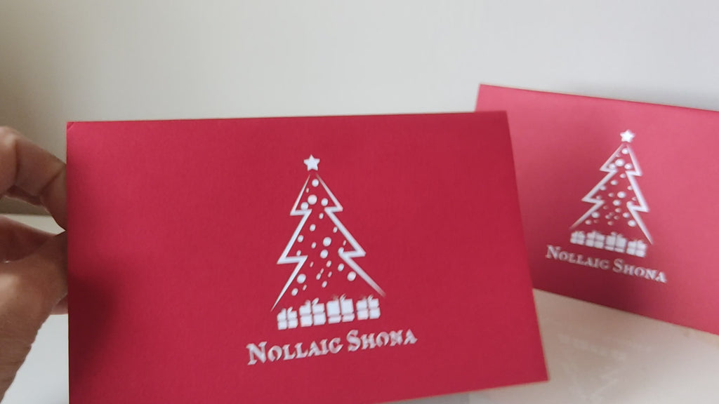 Celebrate the spirit of the season with the Nollaig Shona Tree & Presents card. Featuring a Christmas tree adorned with decorations and beautifully wrapped presents, this Irish language card brings warmth and tradition to your holiday greetings.