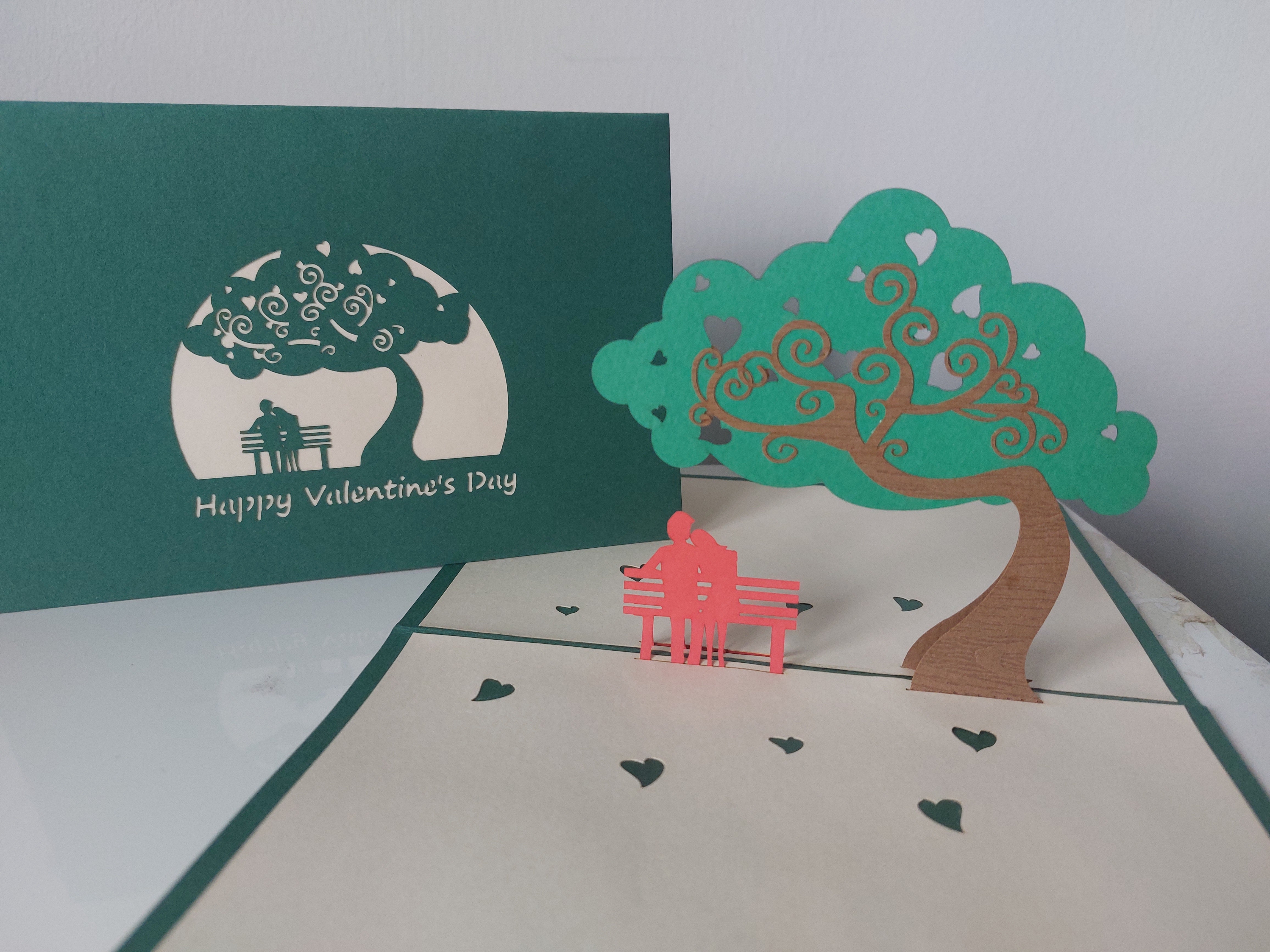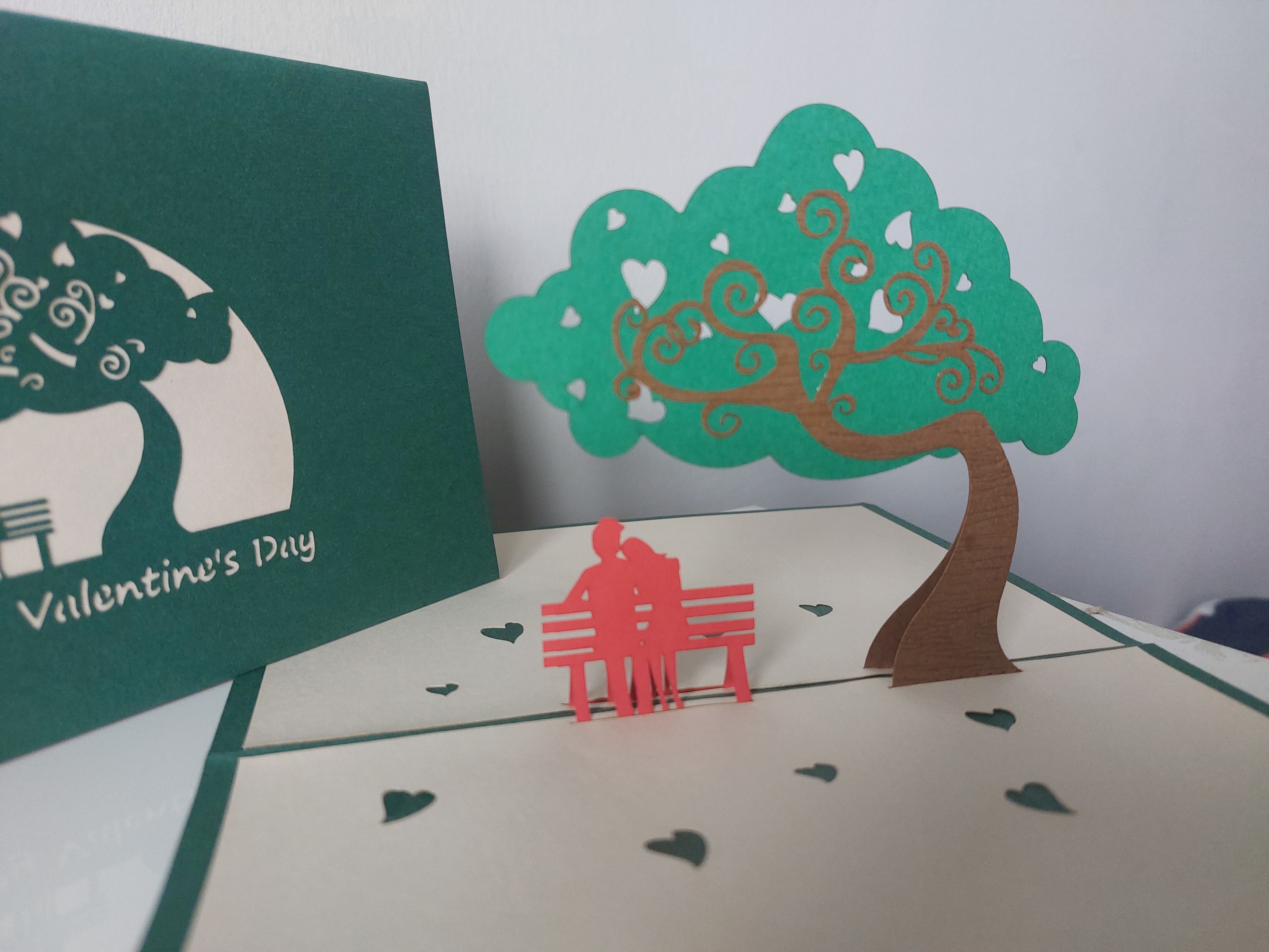 Experience the magic of love with our Valentine's in the Park pop up card! Featuring a couple on a bench, under a tree filled with hearts, this card captures the essence of romance and is the perfect way to express your love this holiday. Spread joy and make your loved one's heart melt with this unique and heartfelt gesture.